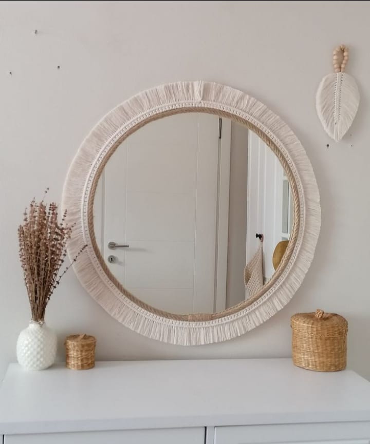 Indulge in our Sana boho wall mirror's neutral tones for a timeless and elegant touch. Transform your bathroom or hallway with effortless style and embrace true beauty. The delicate hessian beading adds a touch of modernity to the mirror while still maintaining its boho charm. Treat yourself to the enchanting allure of our boho wall mirror.