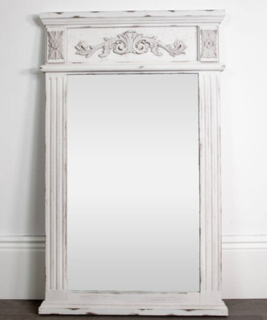 This Classic Wall Mirror has an elegant white wood frame with intricate carvings and a simple rectangular shape that adds a classic traditional style to any room.
