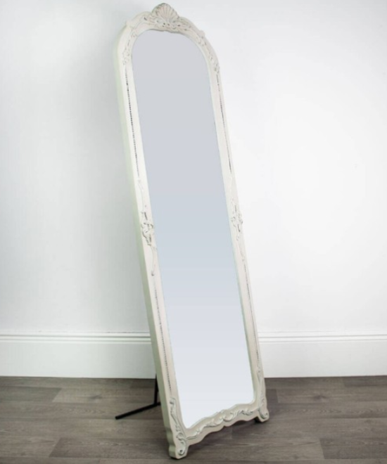 This full-length floor-standing mirror features ornate details on a soft taupe-colored frame, adding dramatic elegance to any modern baroque setting. It includes a fold-out floor stand and is perfect for your bedroom, bathroom, or lounge.