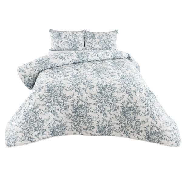 Enhance your bedroom with the Erin Duck Egg Quilt set, bringing the beauty of nature inside. This microfibre set showcases delicate leaf designs against a white background and is fully reversible. For a complete look, match with sheeting in duck egg, white or grey.
