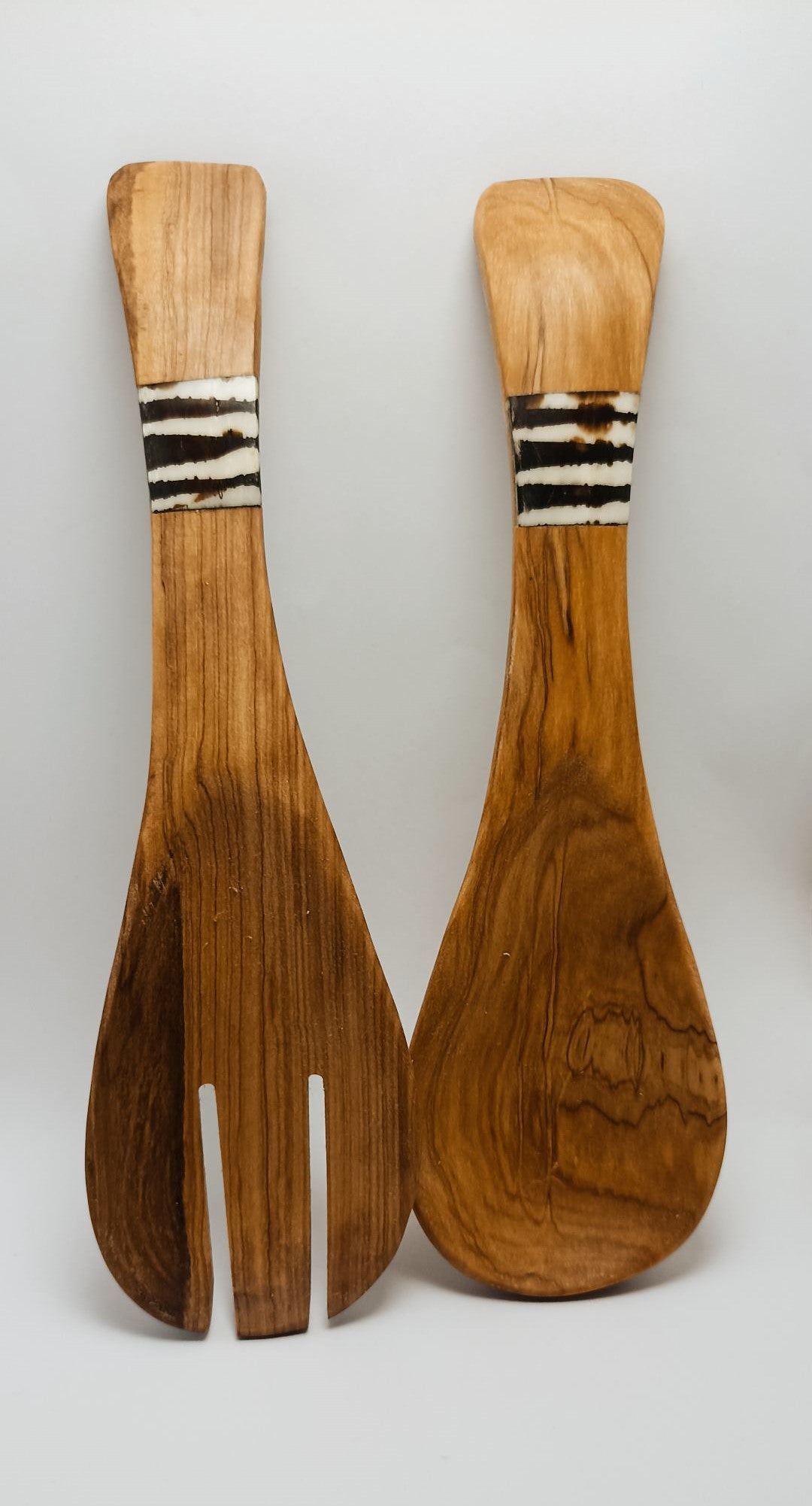 Elevate your dining experience with our Wooden Salad Spoon Set, featuring a stunning patterned bone insert. Handmade by skilled artisans who are passionate about their craft, these spoons will impress your guests and bring a touch of nature to your table. Perfect for any meal, these spoons will enhance your dining experience.
