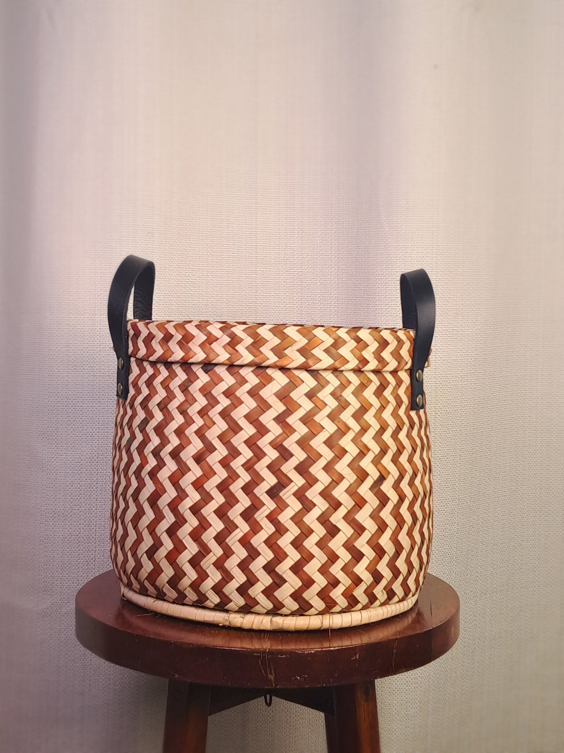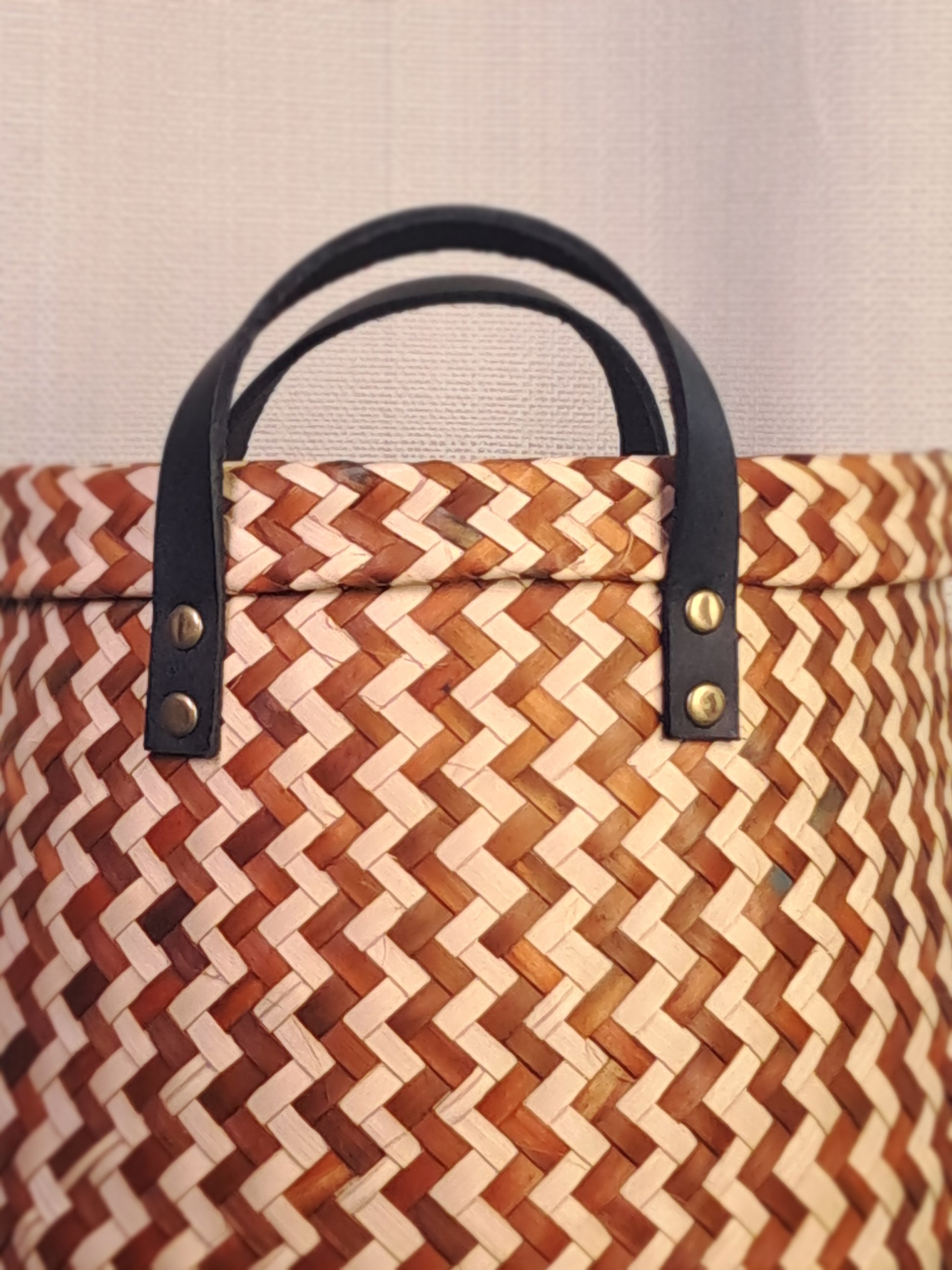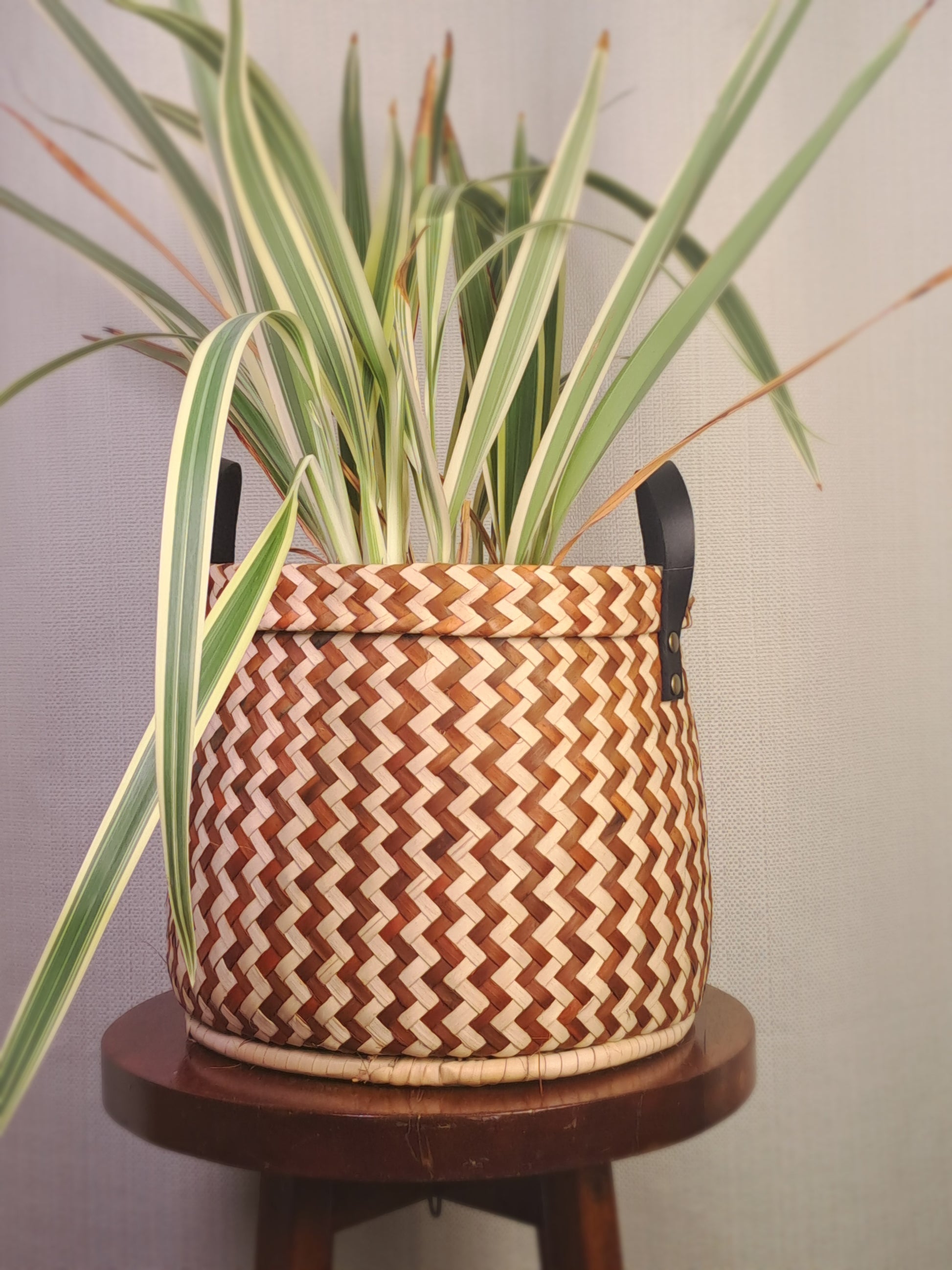 Delight in the exquisite craftsmanship of Zaki Rust planter baskets, made from hand-dyed Palm leaves and featuring a luxurious leather pull handle. Perfect for all your storage needs or as a chic planter for your beautiful plants. This is not just a basket, this is a statement piece for your home! use it in your lounge, entrance hall, bedroom or bathroom and enhance your space instantly! Handmade in South Africa, available in multiple colours.